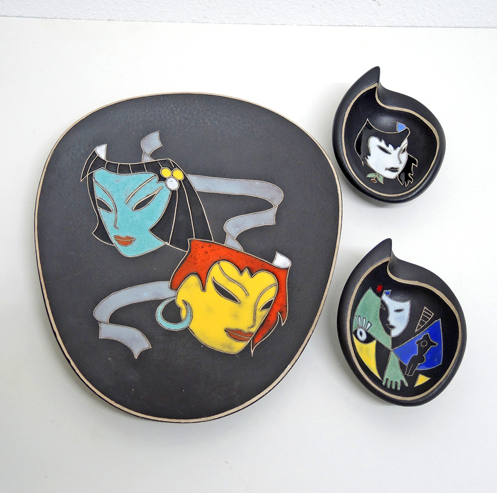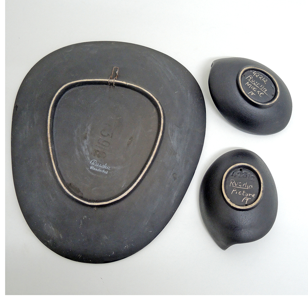 Classic Ruscha Artist’s Picture Bowls, c. 1950, Signed, ceramic, 1x c. 27×23 cm, 2x c. 11.5×8.5 cm, total 1218 g