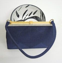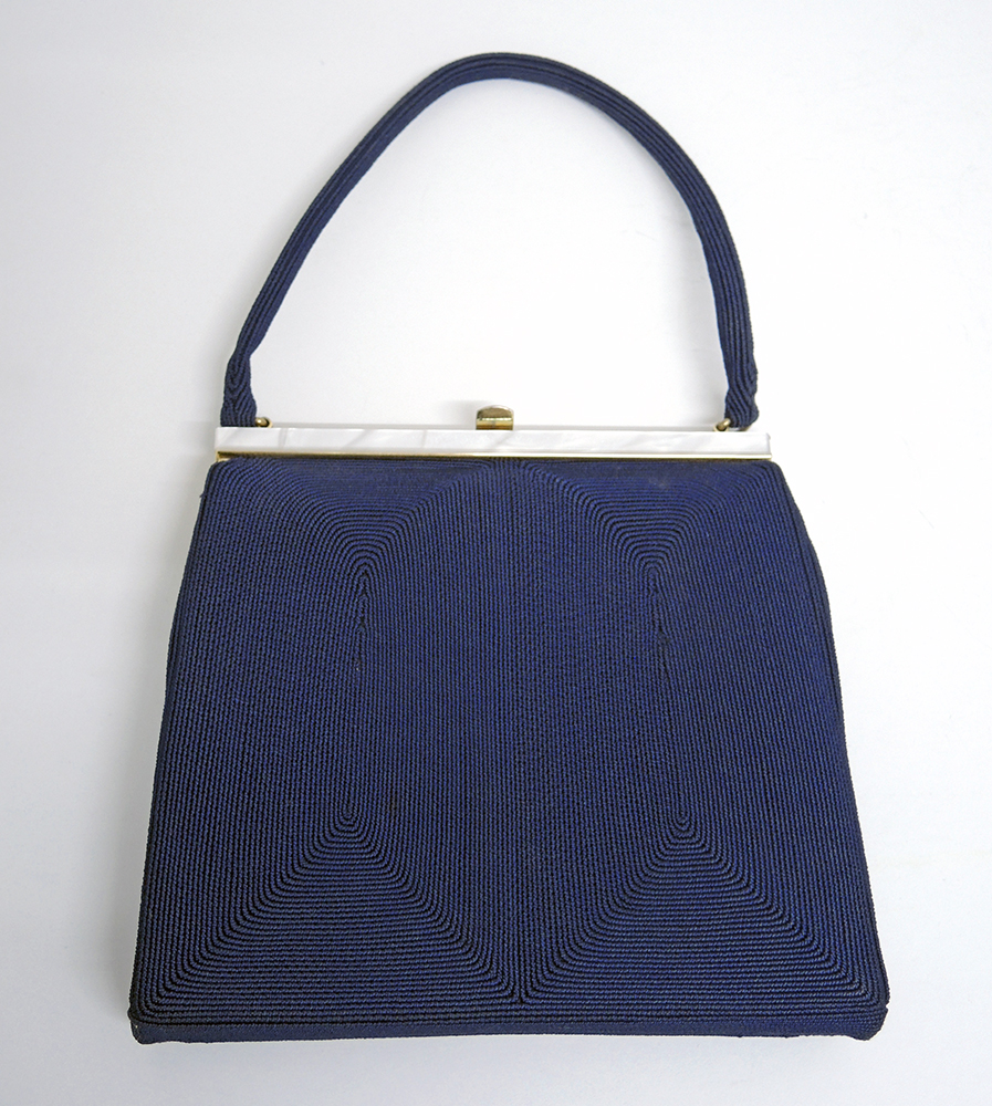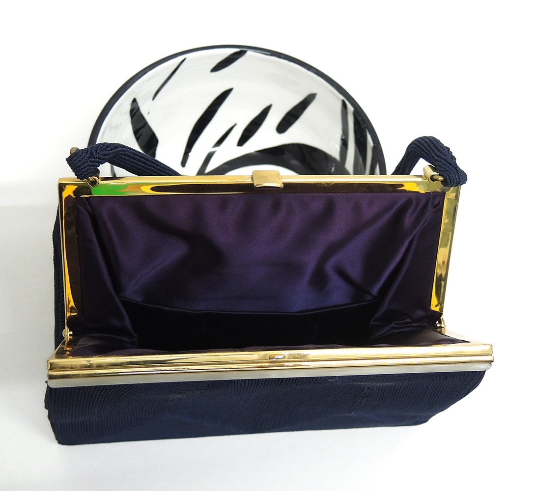 Handbag circa 1950, midnight blue, cord embroidery/brass/burgundy silk lining/mother-of-pearl bar, like new, approx. 18.5×21.5×4 cm without handle, 365