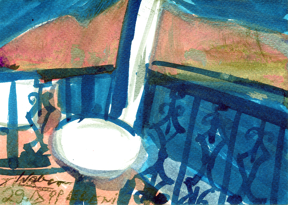Eleni, 29 September 1999, mixed media ink, card approx. 12.5 x 17.5 cm, in aluminium postcard frame