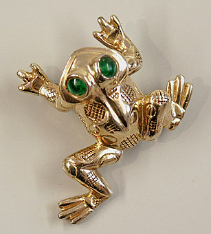 fs14 Frog Brooch, gilt metal, emerald green glass eyes