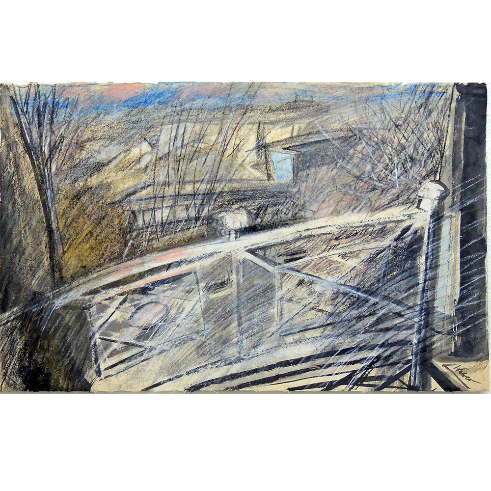 Terrasse, Bern, Taubenstrasse, Mischtechnik auf grünem Papier, ca. 31.5×48.5 cm, i.A. im Halbe Magnetrahmen 40×50 cm