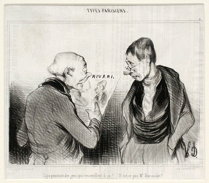 Serie: Types Parisiens. Il y a pourtant des gens qui ressemblent à ça!… N’est-ce pas Mr Durandet? Deux personnages à mi-corps, affreusement laids, contemplent sans d’en douter, leur propre charge sur un numéro de la Caricature Provisoire, tenue par le personnage à droite. Catalogue raisonné. Hazard et Delteil, Orrouy (Oise) 1904 im säurefreien Passe-Partout, 35×50 cm