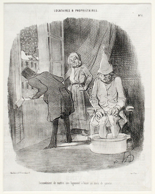 Serie: Locataires et Propriétaires. Inconvénient de mettre son logement à louer au mois de janvier. En chemise et en bonnet de coton, dans sa chambre à coucher un homme est occupé à prendre un bain de pied; ne tenant nullement compte que son locataire est fort peu…vêtu, la concierge ouvre la fenêtre de la chambre afin de permettre à un visiteur de regarder dehors, où l’on voit la neige qui tombe. Catalogue raisonné. Hazard et Delteil, Orrouy (Oise) 1904 im säurefreien Passe-Partout, 35×50 cm