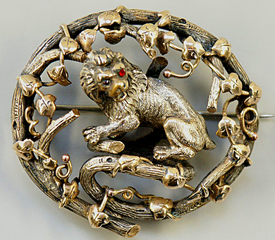 19_44 Lion Brooch, probably apprenticeship work, magnificent piece in full relief, one eye replaced, otherwise perfect, 19th cent., GB/F, bronze/silver- and gold alloys, height ca. 4.7 cm, width ca. 5 cm, weight ca. 42 g