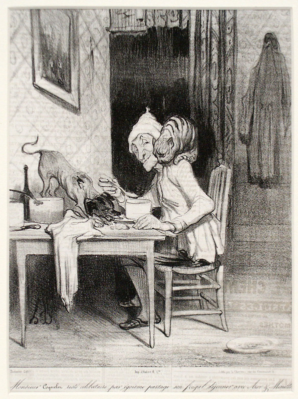 Serie: La Journée du Célibataire. Monsieur Coquelet réste célibataire par égoïsme partage son frugal déjeuner avec Azor et Minette. D’une grande familiarité avec leur maître, Minette a sauté sur l’épaule de M. Coquelet, tandis qu’Azor monté sur la table, se permet de lécher les plats. Catalogue raisonné. Hazard et Delteil, Orrouy (Oise) 1904 im säurefreien Passe-Partout, 35×50 cm
