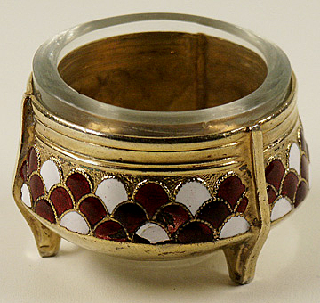 19_26 Salt Cellar, vermeille/enamel, signed Tommet, enamel slightly damaged through use, otherwise perfect, F, silver gilt, enamel, glass, height ca. 3.2 cm, width ca. 4.7 cm, weight ca. 74 g