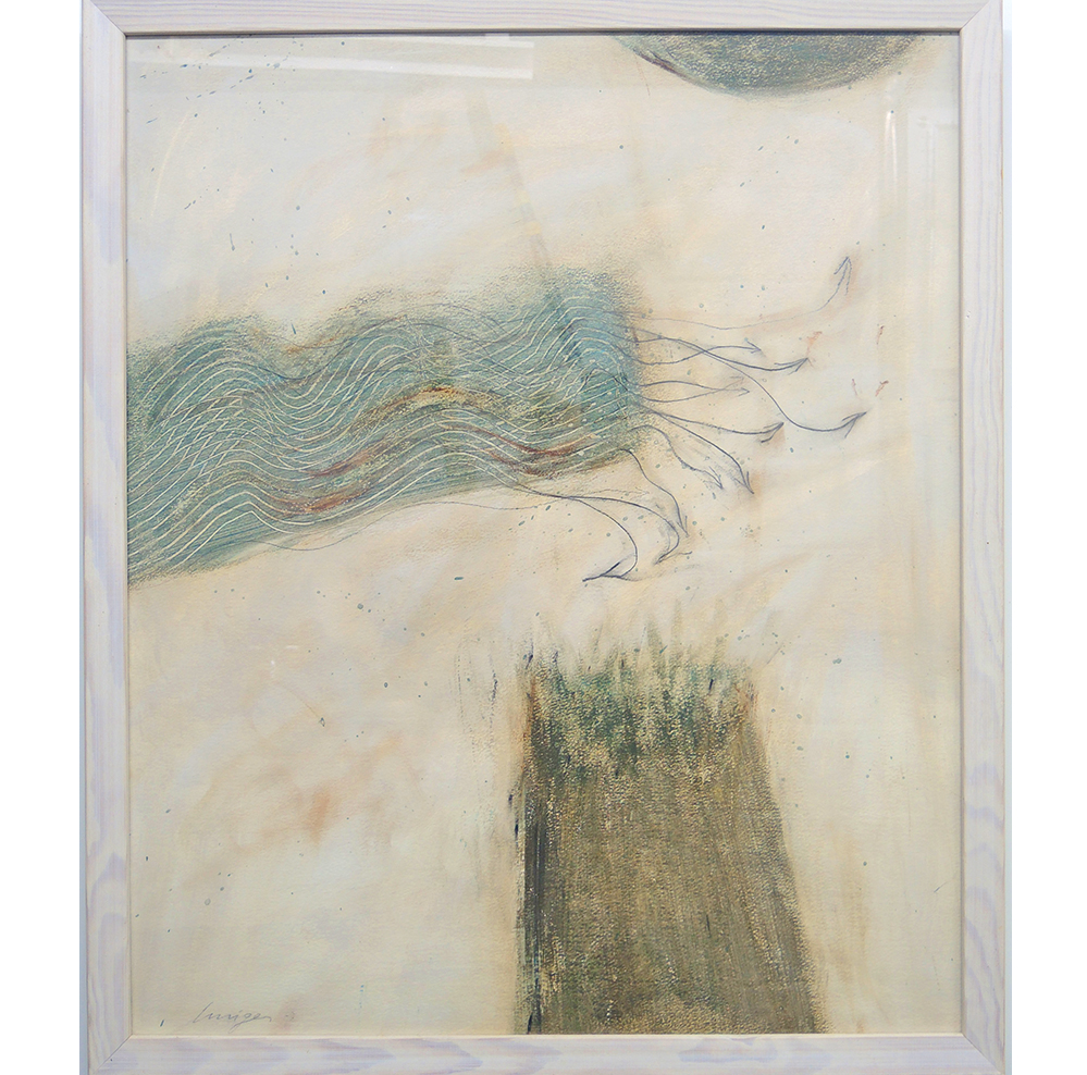 Mischtechnik/Papier, ca. 60×50 cm, im weissen Holzrahmen ca. 60×50 cm, durchs Glas fotografiert mit Spiegelung – wodurch leider viel Subtiles verloren geht…