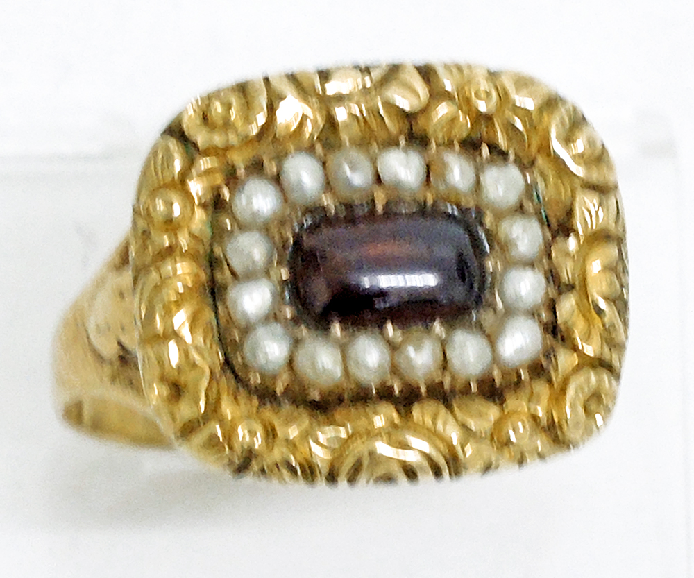Georgian Ring, Almandin Granat, Samen-Perlen, Oberer Teil 18. Jahrh., Ring Viktorianisch, 18/14 Kt. Gold,