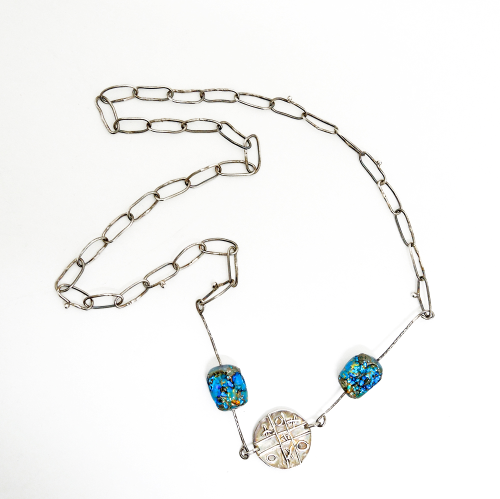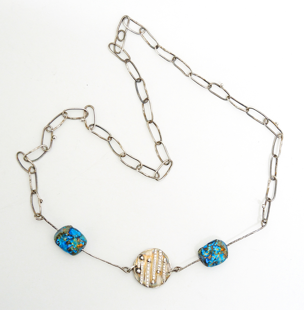 Künstler Sautoir, geschmiedet, mit opalisierenden, beweglichen Glasperlen, Seventies, GB, Silber/Glas