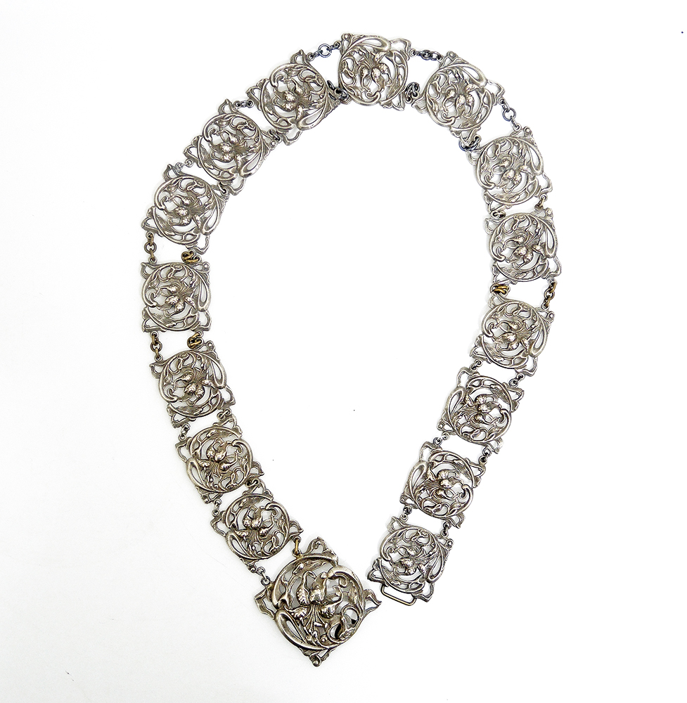 Lilien Gürtel, Art Nouveau, Bronze versilbert, Top Original-Zustand, L ca. 74 cm, B ca. 3,5/5 cm, Achtung für schlanke Taille – oder mit geringem Aufwand atemberaubendes Sautoir! 187 g