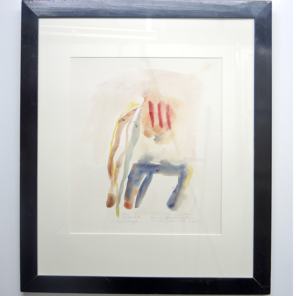Aquarell mit Widmung, ca. 43×37 cm, im schwarzen Holzrahmen ca. 72×61 cm, durchs Glas fotografiert mit Spiegelung – wodurch leider viel Subtiles verloren geht…