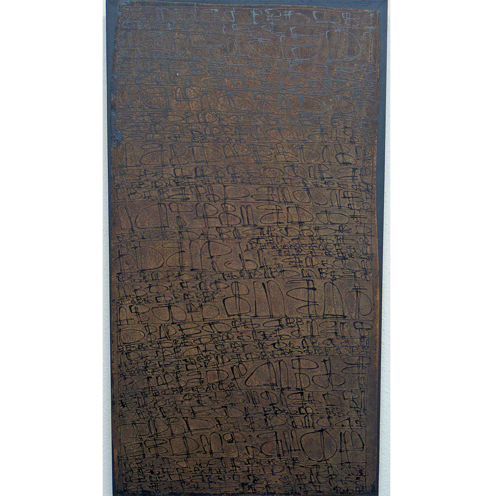 Schriftzustand, Eisen geätzt auf Holz, ca. 36×66 cm ©Edith Schmid