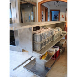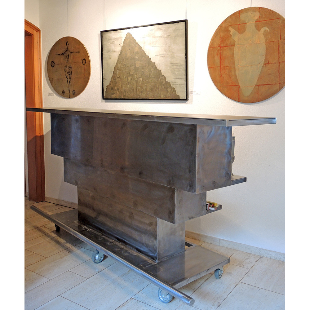 Ultimative Bar/Theke von Lukas Hofkunst (http://www.hofkunst.ch/Lukas_Hofkunst/Lukas_Hofkunst.html), Unikat, Chromstahl, Kunstschmiede-Arbeit, auf die ich 2 Jahre warten musste. Wert CHF 15’000-20’000. Bester Zustand. B 250 cm, H 118 cm, T45 cm. Auf 3 Ebenen können auf der Rückseite Harasse, Flaschen, Gläser, Tassen – eine Kaffeemaschine etc. verstaut werden. Die Bar ist auf 6 Rollen und kann leicht verschoben und transportiert werden. Zustand erstklassig. Auf Wunsch können Gläser und Tassen/Untertassen mit-übernommen werden. Abholung nach Vereinbarung möglich.